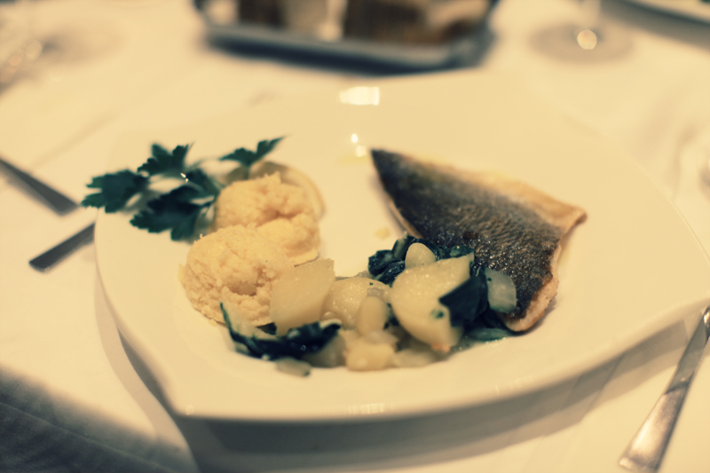 Goldbrassenfilet gegrillt mit Mangold und Kartoffeln und Polentanockerln