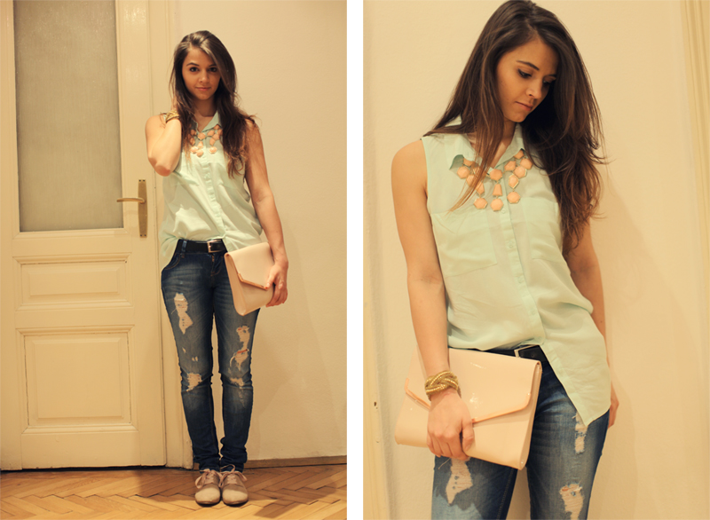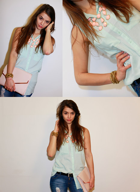 Ich bin total verliebt in meine neue mintfarbene Bluse und meine hell rosa Statement Kette von H&M. Und da ich die Farbkombination einfach traumhaftt finde, habe ich meine 2 neuen Lieblingsteile mal gleich mit einer Jeans von Bershka kombiniert. Ich finde die Jeans verleiht dem Outfit, durch ihren Used-look noch den gewissen Pepp. Perfekt für einen netten Abend mit Freunden.