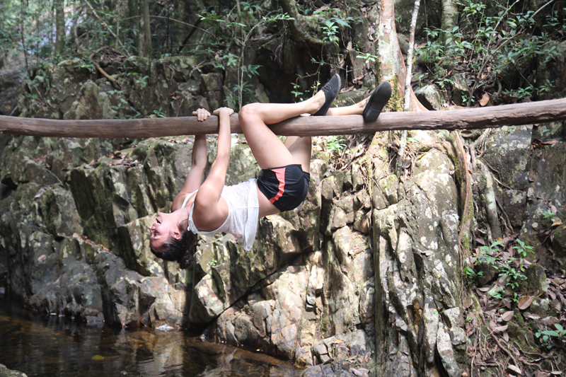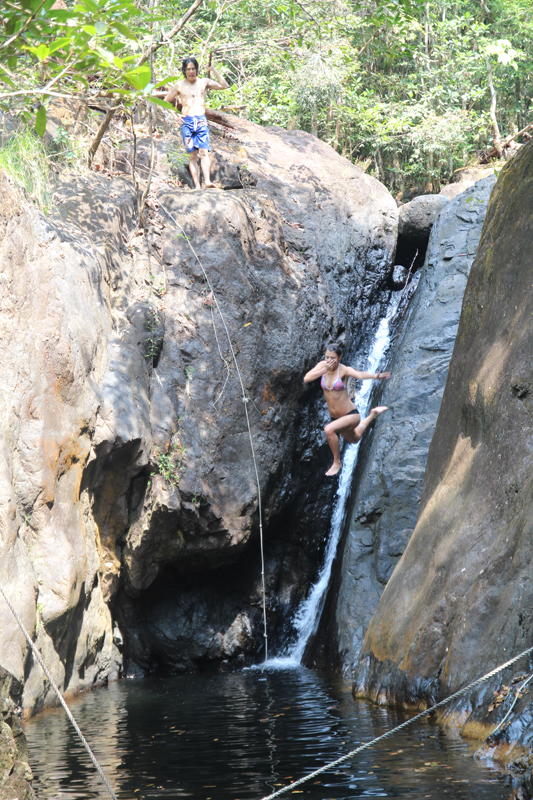 Raht ist eigentlich der Einzige auf Koh Chang der so eine Art von Tour macht. Der Dschungel ist sein zweiter Zuhause und er bezeichnet sich selber als Monkey Man. Ich glaube er kennt jeden Baum und jeden Ast in diesem Dschungel. Wenn man 7 Tage die Woche dort unterwegs ist, ist das aber kein Wunder. Freitags hat er immer die schwierige Tour, wo man bis zum Gipfel geht. Da wir aber gehört haben, dass die normale Tour anstrengend genug ist, beschlossen wir diese zu machen. Es war wirklich sehr toll und ein Wahnsinns Erlebnis. Wir mussten unter umgefallenen Baumstämmen durchkrabbeln, vor Riesenbienen flüchten, Tarzan spielen, und Riesenameisen ablecken. Ganz besonders toll fand ich die Wasserfälle im Dschungel. Ich habe mich sogar getraut, von 4 Meter Höhe in einen hinein zu springen. Natürlich hat uns Raht auch weniger schöne Tiere wie Skorpione und Vogelspinnen gezeigt. Ich war aber sehr froh darüber, dass es bei diesen Tierchen geblieben ist und wir keine Schlange gesehen haben. Nach 7 Stunden Äffchen spielen, war ich komplett erledigt und war wirklich froh, als wir endlich wieder beim Auto ankamen. Es war echt ein tolles Erlebnis und man sollte es unbedingt machen wenn man dort ist. Wichtig ist, dass man so wenig wie möglich mitnimmt, ein kleiner Rucksack reicht und bequeme Schuhe sind von Vorteil. Für Essen und Trinken ist den ganzen Tag gesorgt.