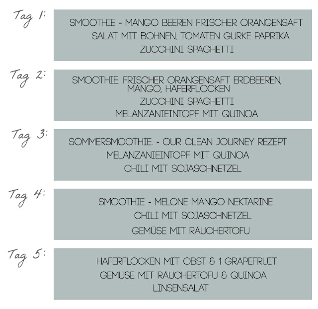Ich habe mich für die Vegane-Variante entschieden und eigentlich wollte ich den Detox Plan von Our Clean Journey machen und ich habe ihn mir auch gekauft. Die Mädls haben sich einiges überlegt und der Plan ist auch wirklich nett aufgebaut. Kurz und knapp wird alles beschrieben, man erfährt das wichtigste zum Thema Detox und natürlich gibt es auch einige Rezepte. Wenn ich aber ganz ehrlich bin, findet man das meiste wenn man nur danach sucht im WWW.