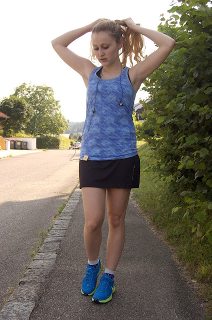 Ich bin ein totaler Fan von bunten Laufoutfits und besitze verschiedene Hosen, Shirts und Westen zum Laufen (meist von H&M) und sogar einen Laufrock. Mir persönlich ist dabei wichtig, dass nichts runterrutscht, daher sollte alles zum Binden sein! (praktisch ist natürlich auch eine Ziptasche für einen I pod)